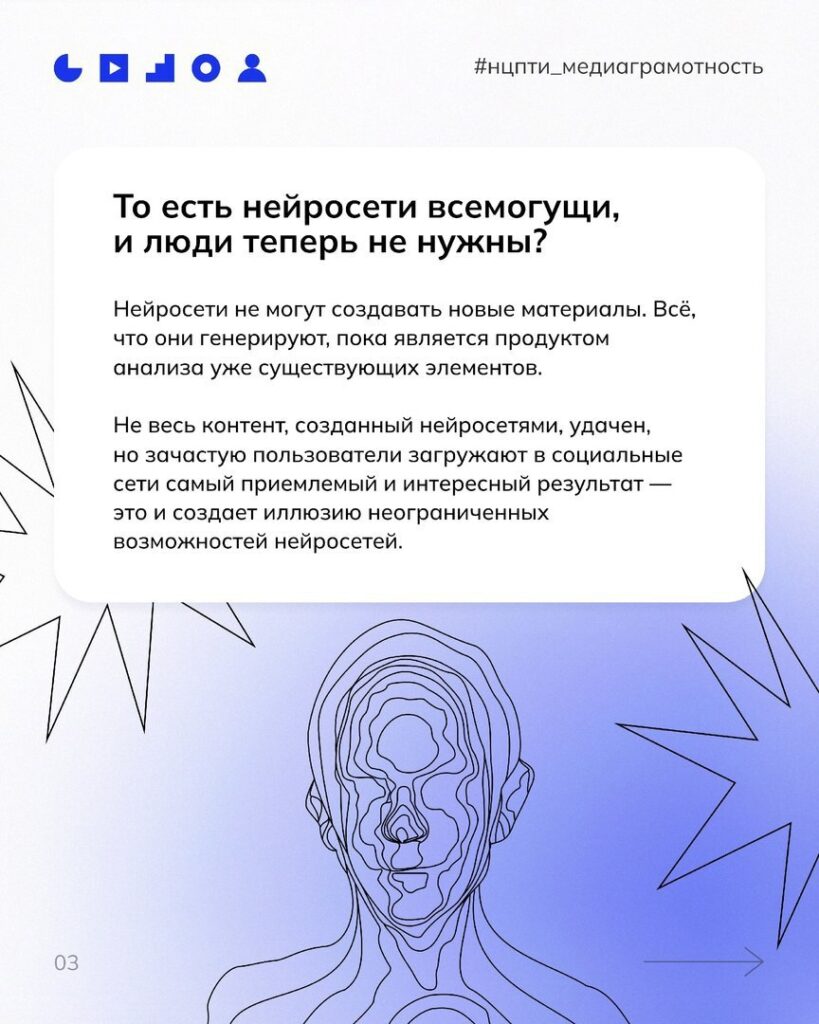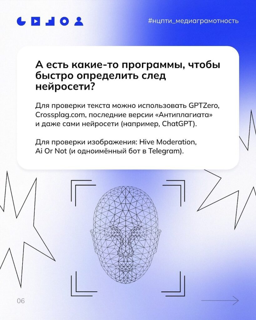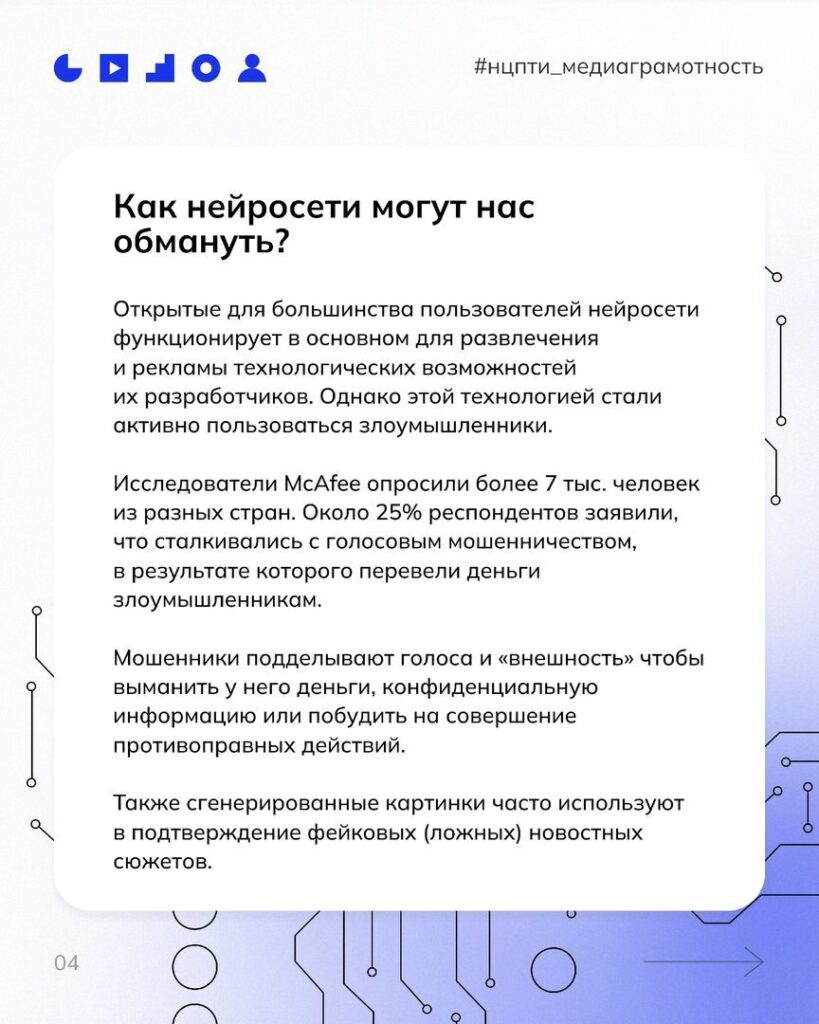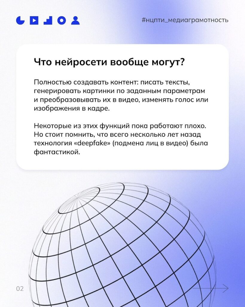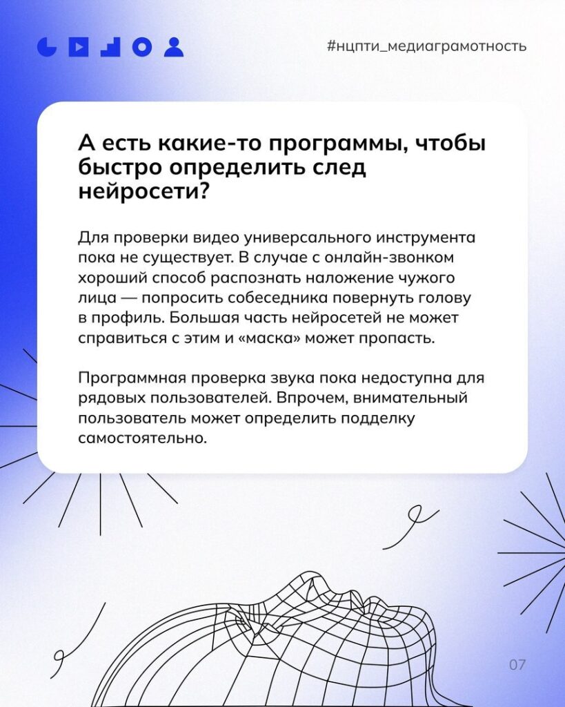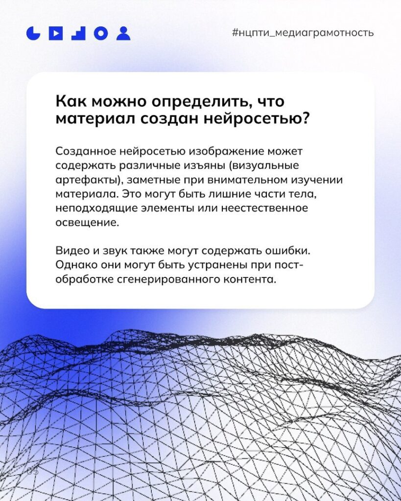 В карточках от Национального центра информационного противодействия терроризму и экстремизму собраны простые правила, которые помогут не стать жертвой обмана нейросетей.