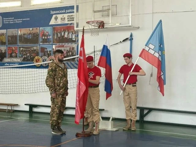 Торжественное внесение Знамени Победы в Здвинской школе №2, доверили выпускнику школы и одному из первых юнармейцев района Михаилу Балесному.